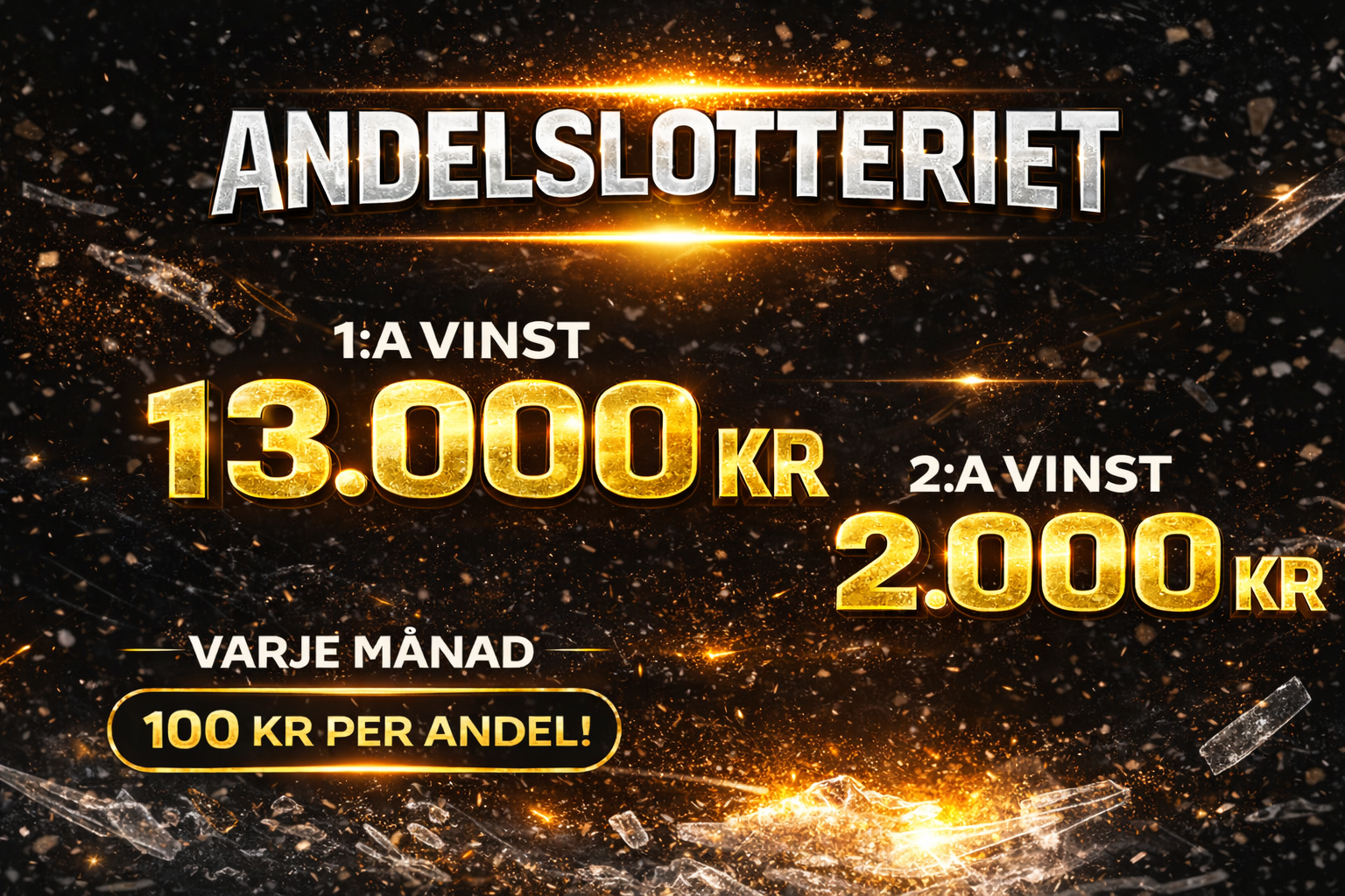 SAIK Bandy lanserar i våras andelslotteriet där du för en insats på 100:-/andel har chansen att vinna en ansenlig summa pengar varje månad samtidigt som du stöttar föreningen ekonomiskt. Lotteriet består av 300 lotter och det lottas ut ett förstapris och ett andrapris varje månad.